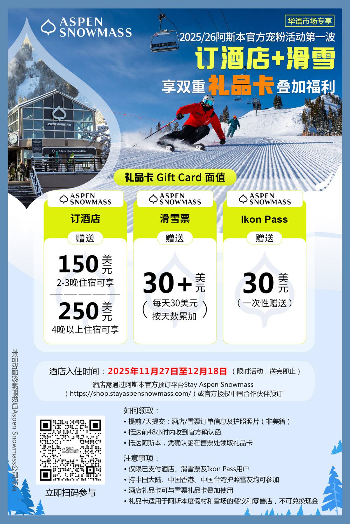 1、酒店礼品卡申请条件:需通过Stay Aspen Snowmass,或官方授权中国合作伙伴预订2025年11月27日至12月18日期间入住的酒店,且预订人须持有效中国大陆、中国香港、中国台湾护照;