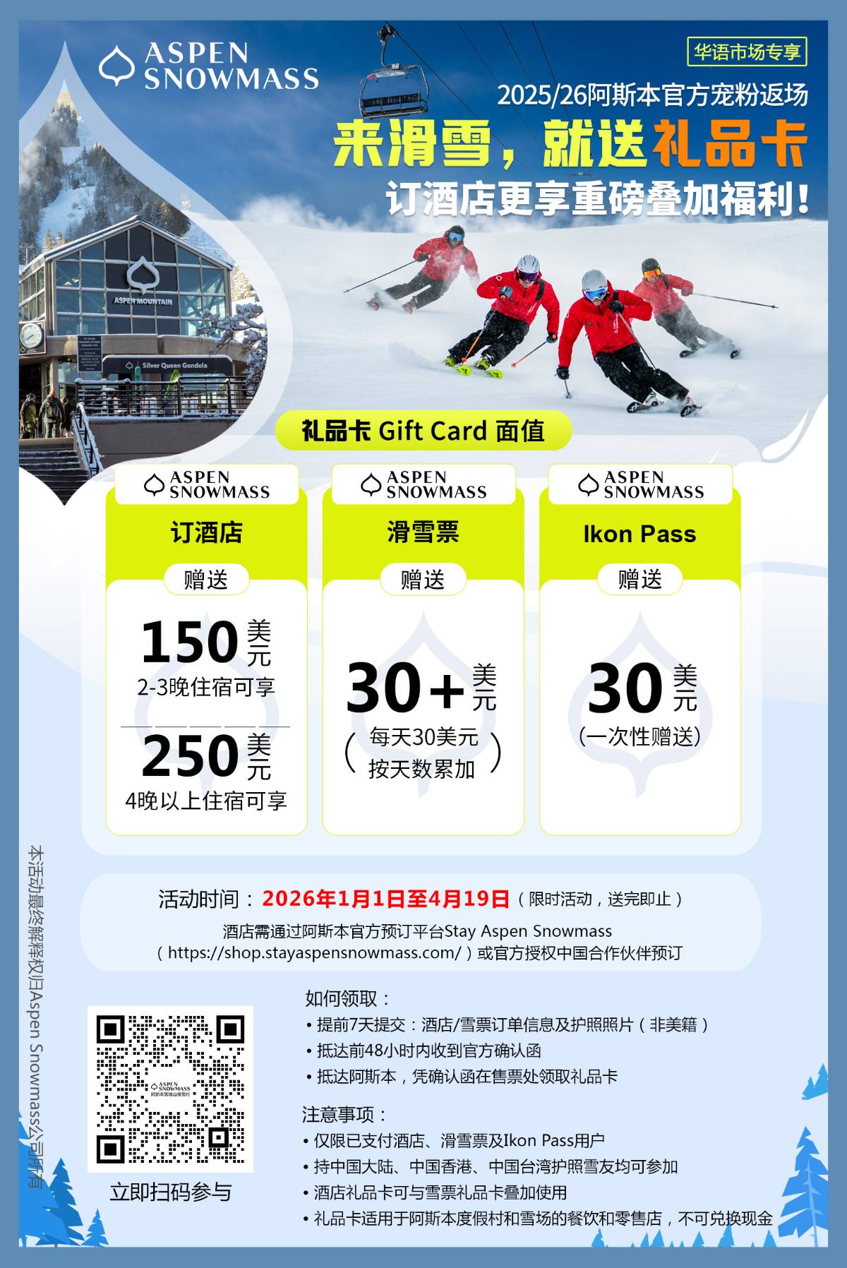 通过官方预订平台Stay Aspen Snowmass(https://shop.stayaspensnowmass.com),或官方授权中国合作伙伴预订酒店的雪友,更可以叠加更高价值的礼品卡使用!