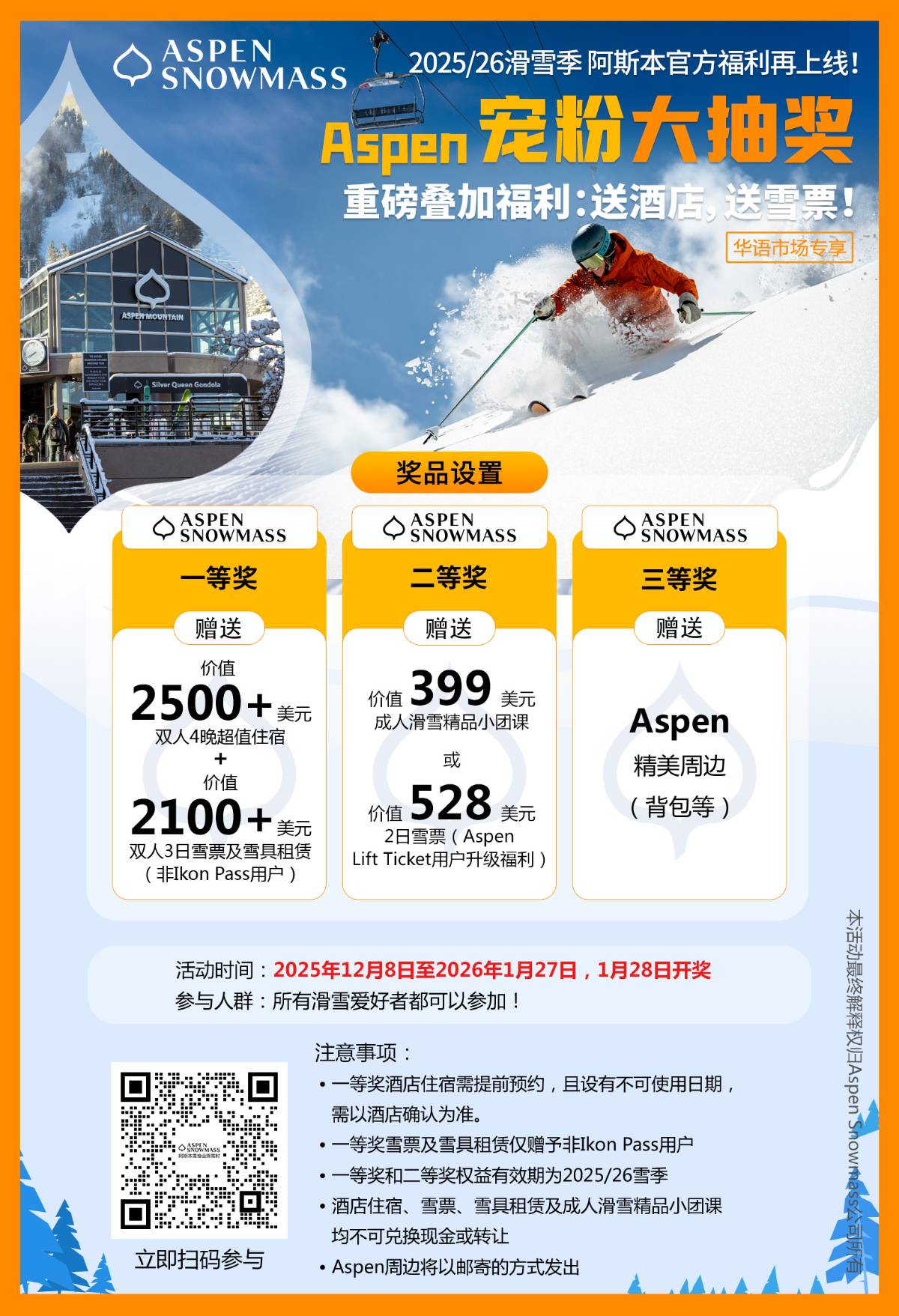 2、【滑雪】礼品卡仅限已支付Aspen滑雪票及Full Ikon Pass用户领取。Premier Pass、亲友优惠券、Ikon亲友票、Mountain Collective Pass和团队票均不符合领取条件。赠票用户及7岁以下免费滑雪儿童不参与礼品卡领取活动。
